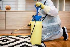 Technicien en extermination appliquant un traitement antiparasitaire à domicile pour éradiquer les infestations de nuisibles.