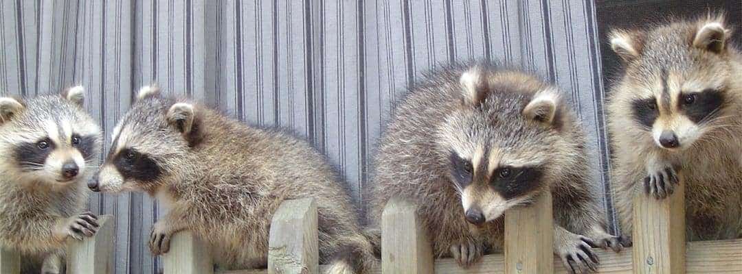 Groupe de ratons laveurs domestiques à proximité d’une clôture en bois, représentant le service d’extermination de nuisibles offert par SOS Extermination à Montréal.