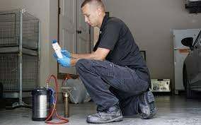 Professionnel en extermination de nuisibles préparant un traitement pest control dans une résidence moderne.